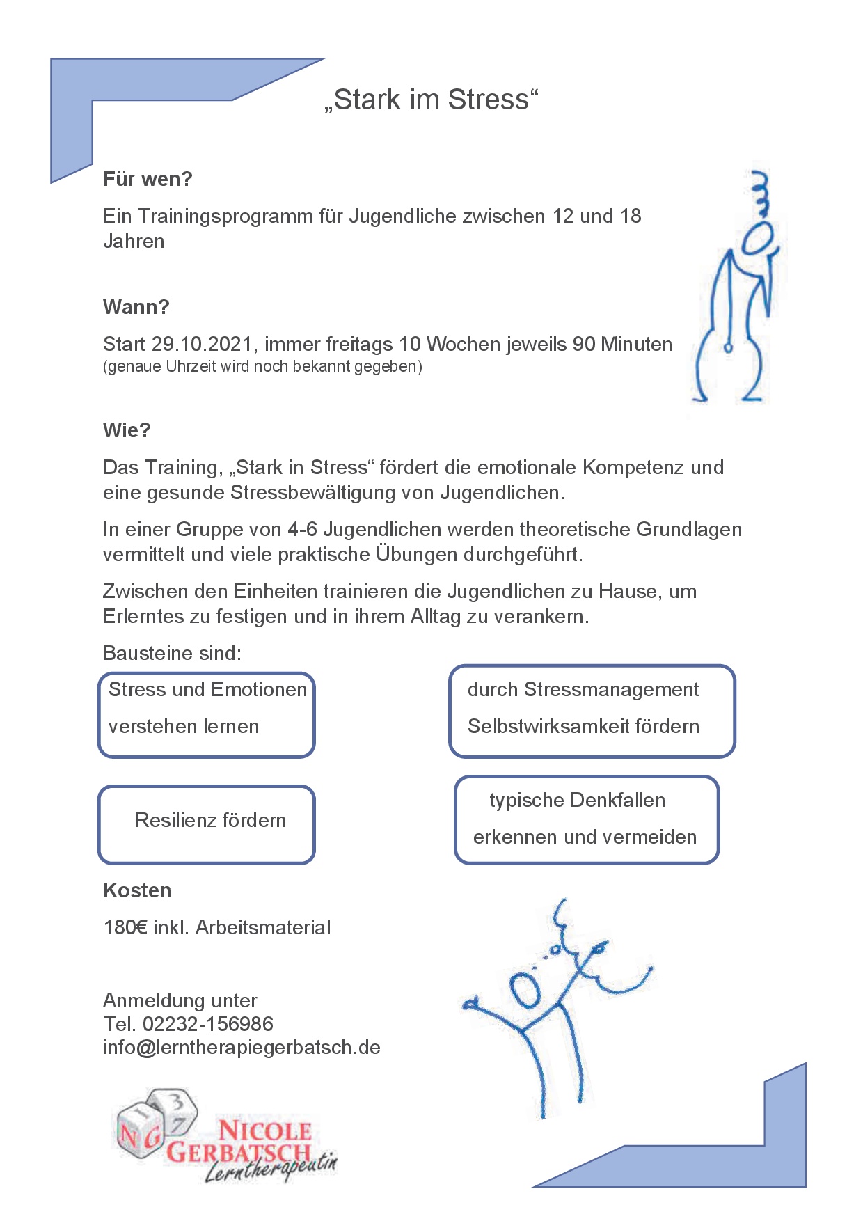 Nach den Herbstferien startet das Training “Stark im Stress”. Das Training ist ein bewährtes Programm zum guten und gesunden Umgang mit Stress und unangenehmen Emotionen.
