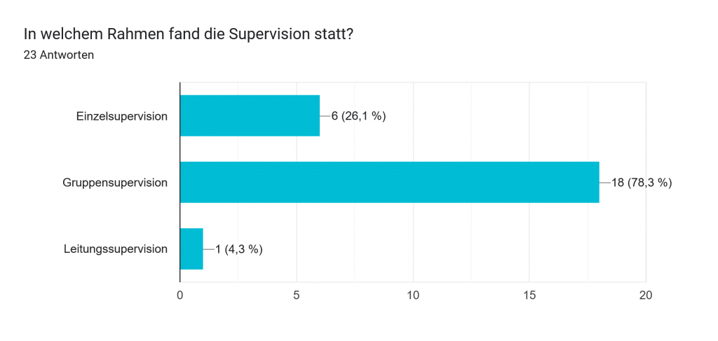 - Ich fand die Dauer angemessen. Ein längeres Setting wäre wahrscheinlich nicht zielführender, da man nach einer Supervision Zeit braucht, um über das Erarbeitete nachzudenken und sein Handlungsschritte abzuleiten.